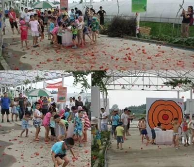 小朋友们被分成两组,每组一筐番茄,大家在自己的领地向对方发起攻击!“嘟……”随着村长大叔的一声哨响,番茄大战激励开战!双方都发起猛烈地攻击。(不要担心啦,不会浪费滴,带战争结束后,这些番茄会被拿去喂这里的小动物。)