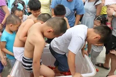 爸爸妈妈们体验完了之后,就该我们的小朋友们上场了。爸爸妈妈们先把扔进场外的番茄捡进篮子里……孩子们,上!一定要把番茄踩得越烂越好哦!我踩,我踩,我踩踩踩!