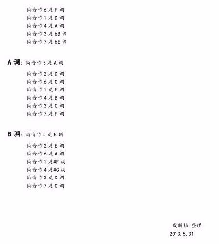 方法:竹笛调性固定时,指法的变化与竹笛基本指法筒音作 5 相比较,如果此时指法比筒音作 5 高(例如筒音作 6b7 ),则以竹笛调性为基础向下减去相差度数;如果实际指法比筒音作 5 低 ( 例如筒音作 432 1) ,则以竹笛调性为基础向上加上相差度数,即可快速算出乐谱的实际调性。请看例证: