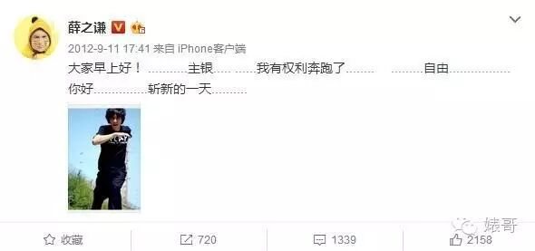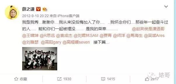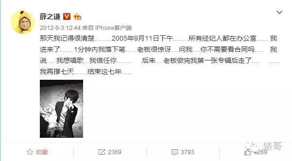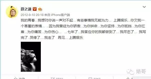 2012年,合约期满,要解约的那几天,薛之谦更是连发两次微博表达自己离开的心情。有不舍、有难过、有期待……