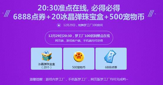 12月29日20:30,梦工厂100房间整点在线,网页端、游戏客户端、手机端整点在线均可获得6888点券+20冰晶弹珠宝盒+500宠物币