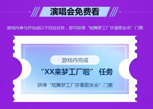 游戏内参与并完成以下对应任务,即可获得“炫舞梦工厂许嵩歌友会”门票!