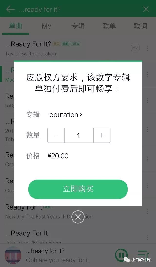 今天,突然对 Taylor Swift - Ready For It? 着迷不能自拔;小白去QQ音乐搜了下,结果专辑需要付费20元,作为学生狗,囊中羞涩的我找到了一款付费音乐下载器,现在分享给大家!下边是QQ音乐付费截图和小白喜欢听的曲子。