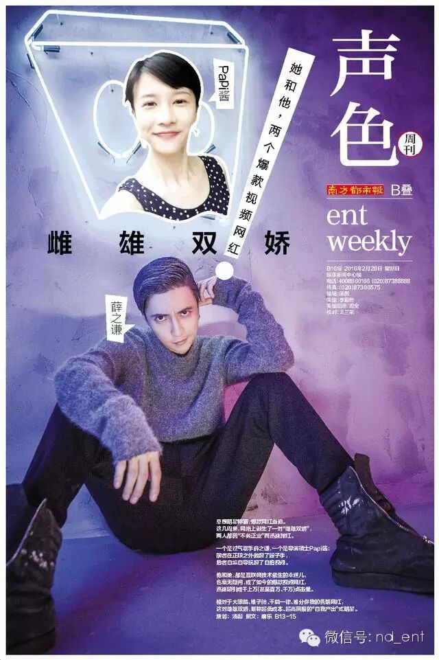 这几周来,网络上诞生了一对“雌雄双娇”,两人都因“不务正业”而迅速蹿红。一个是过气歌手薛之谦,一个是导演硕士Papi酱;前者在正职之外做起了段子手,后者自编自导玩起了自拍视频。