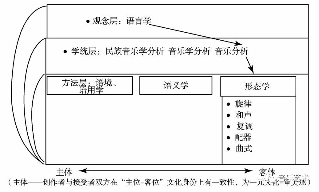 从当代人文社会科学的发展史看,包括系统论、符号学、生态学等在内的那些具有科学革命的范式及起到引领新的时代潮流作用的重要学术思想观念,几乎都含有受到语言学影响的明显痕迹(参见图4)。有学者认为:“语言学在当时变成学者们竞相效仿的模式,原因一方面在于语言被视为文化的核心,另一方面在于语言学似乎已发展出一种观察文化模式化现象以及讲话者无法意识到的所谓‘深层结构’的精确方法。”[3]在这语言学方法引领了整个哲学社会科学新潮流的过程中,音乐学、文学同语言学等人文学科一样,在长期的发展历史过程中成就了自己的分析描写方法。尤其是在传统方法论范畴,音乐学是受语言学方法论影响最深的学科之一。当语言学通过语言符号学重新成为哲学社会科学的标志性方法后,音乐学和民族音乐学也涉入其中,重新成为受惠较大的人文学科。而民族音乐学分析又根据自己的研究对象及其文化语境的要求,进一步选择、接纳了人类学的多元文化(跨文化)研究观和“主位客位”“局内局外”观,从而体现出自身区别于其他音乐分析思维的某些个性化的分析思维和方法。由此可以说,音乐学分析和民族音乐学作为两种较新的方法论思维,便是在这样的学术环境和氛围中得到发展,并且达至其成熟状态。在今天的“广义音乐学”(包含民族音乐学、音乐社会学等)范畴,受社会学的接受理论思维和人类学的多元文化(跨文化)分析思维的影响,一种借助于异文化分析对本(音乐)文化进行反思和检讨的做法又开始为人们所重视。所以说,音乐学分析和民族音乐学分析均兼顾了跨学科因素、思维因素、学科因素及工具性因素,以至都兼具观念层、学统层和方法层三种不同层次特征(参见图5、图6)。其中,民族音乐学分析从理论和分析实践上假定并包括了其他两种分析范式的因素,对于不同范式分别强调的“形态、语义、语境”等符号学分支的学术观念给予了综合的应用,又根据传统音乐具有的“跨(异)族群阶层”文化研究的性质,尤其强调了其中语境的因素(参见图6)。故而,民族音乐学分析是我们从事该类课题研究的过程中,应该首先予以考虑的一种分析思维和方法。音乐形态分析对其他两种分析方法产生从属性和依附性,也就成为当今学术发展的必然趋势。