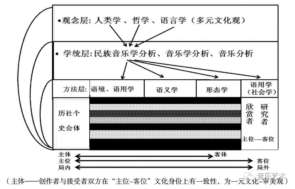 由此可见,从同一性角度看,音乐学分析与民族音乐学分析,都以人(历史、社会)与研究对象的关系为基本范畴。不同点在于,民族音乐学分析又首先以人(研究者与被研究者)的文化身份(局内局外)和观念视角(主位客位)的区分为出发点,然后才去考虑人与其他对象因素的关系。