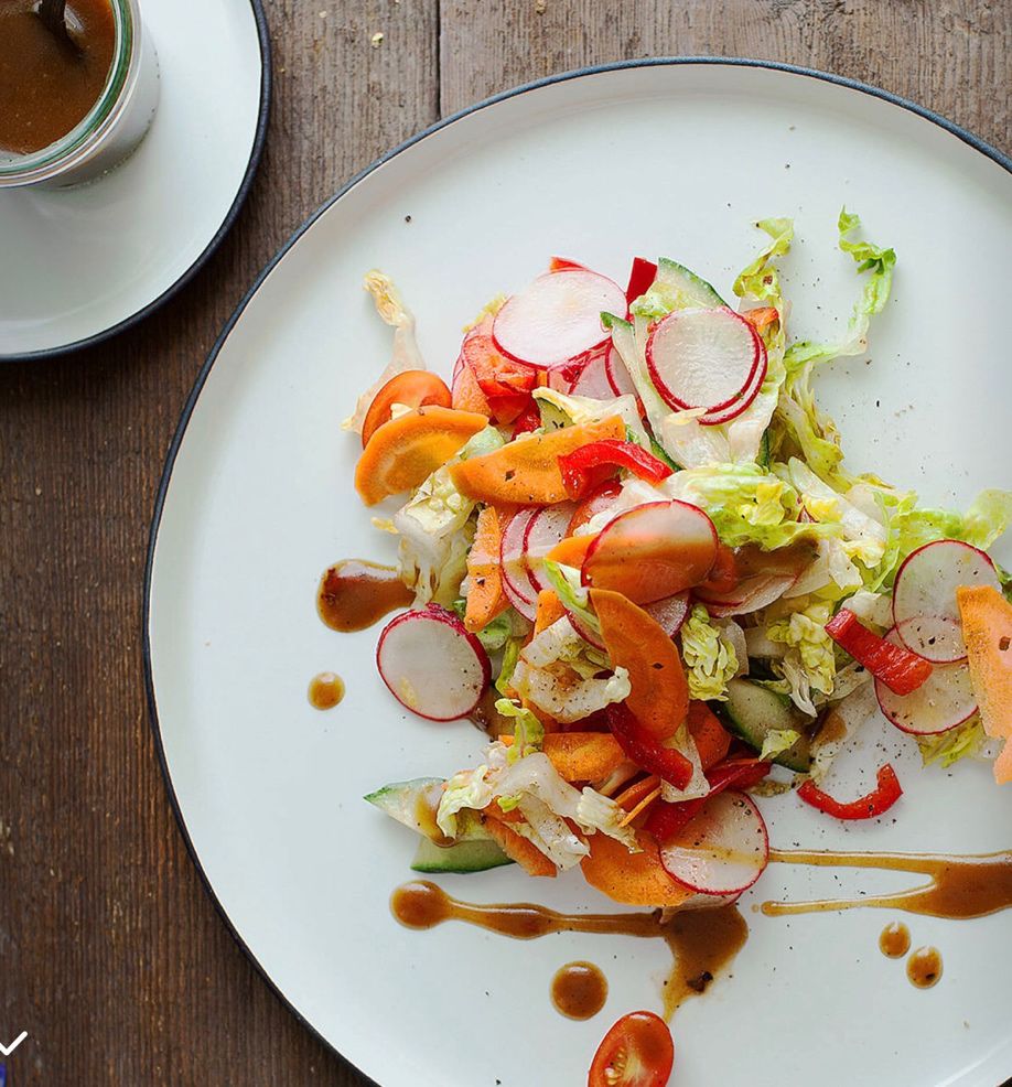 除了汤,第一次用了纯素的沙拉入菜单。这次的伊甸花园,是主厨闺蜜多年前的获奖沙拉配方。可能很多人都有的困扰就是,沙拉到底要配什么酱汁?