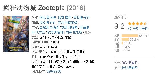 《疯狂动物城》上映后,在很多人心中,它已经是今年的奥斯卡最佳动画。目前上映的动画电影几乎没有可以和它抗衡的。这部电影的名字zootopia 是zoo 和 utopia 的结合,翻译成动物乌托邦更为贴切,但片名随意并不影响影片的质量,在豆瓣上给出了9.2的高分。