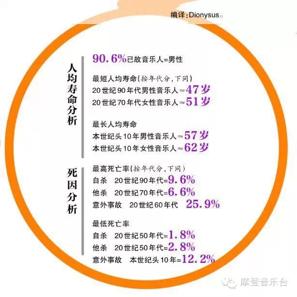 这个结果多少令人不安。拿这个数据与过去 70 多年普通美国人人均寿命对比,这些流行音乐人平均寿命至少少活 25 年。其中意外死亡率高出普通美国人 5 至 10 倍,率高出 2 至 7 倍,谋杀死亡率也超出了 8 倍之多。依靠这些年轻人的音乐行业至少应该有个系统为那些陷入情绪焦虑等危机中的音乐人提供各种帮助。——戴安娜 · 肯尼