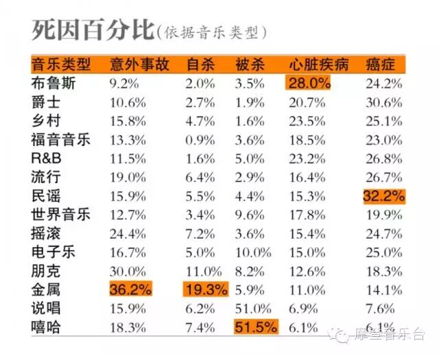 关于这个谜团,澳大利亚悉尼大学心理学及音乐教授戴安娜 · 肯尼针对 1950 年至 2014 年 6 月去世的 12665 名流行音乐人(涉及摇滚、乡村、爵士、布鲁斯、说唱乐、世界音乐等众多流派)的调查中有着意想不到的发现。