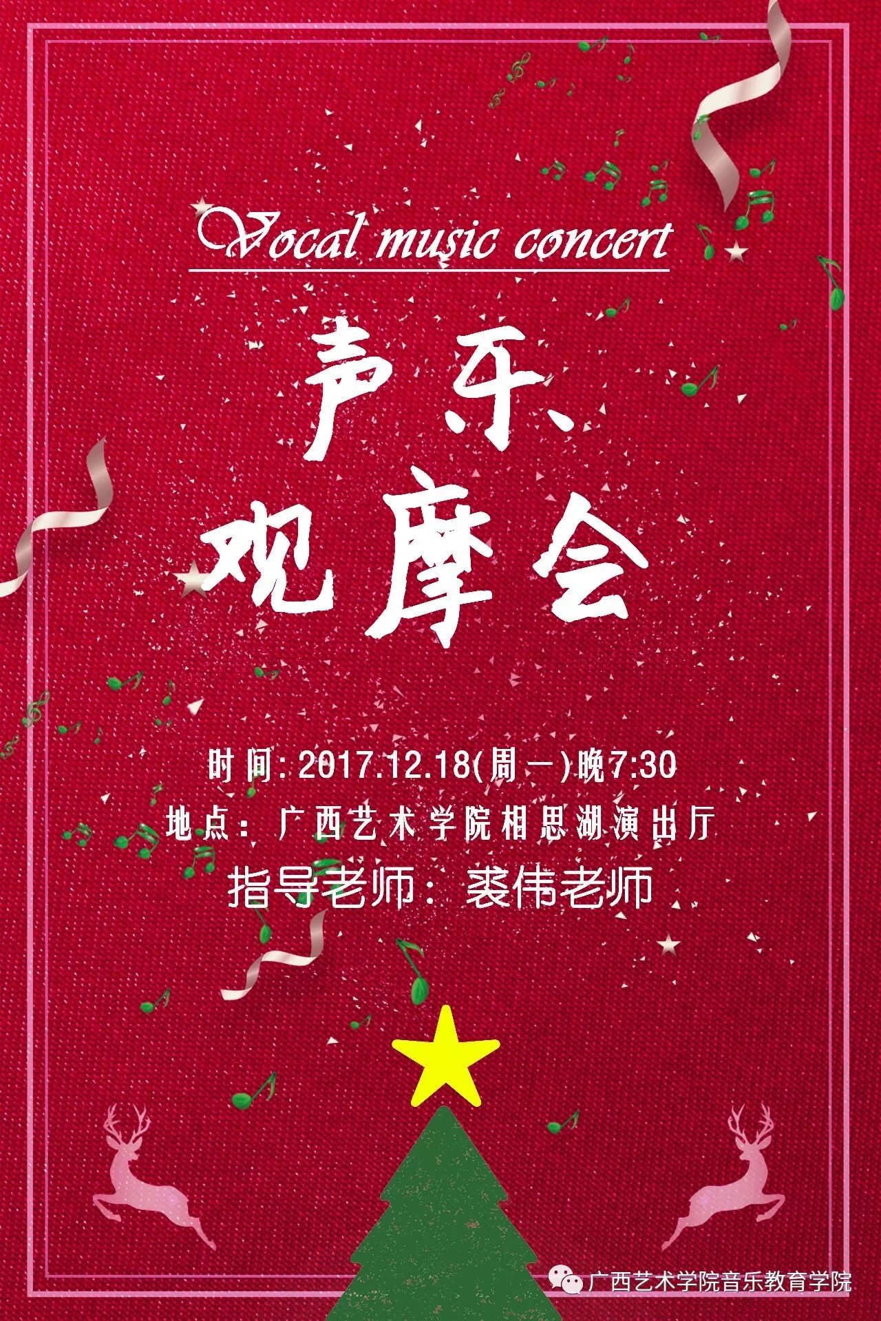 兹定于2017年12月18日19:30于广西艺术学院相思湖演出厅举办“裘伟学生观摩音乐会”。