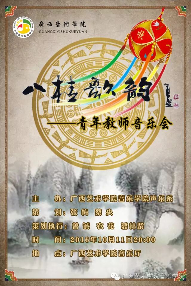 2016年10月11日(周二)晚8点,由音乐学院声乐系主办的《“八桂歌韵”——青年教师音乐会》将在学校南湖校区音乐厅精彩上演,欢迎广大师生前来聆听、指导!