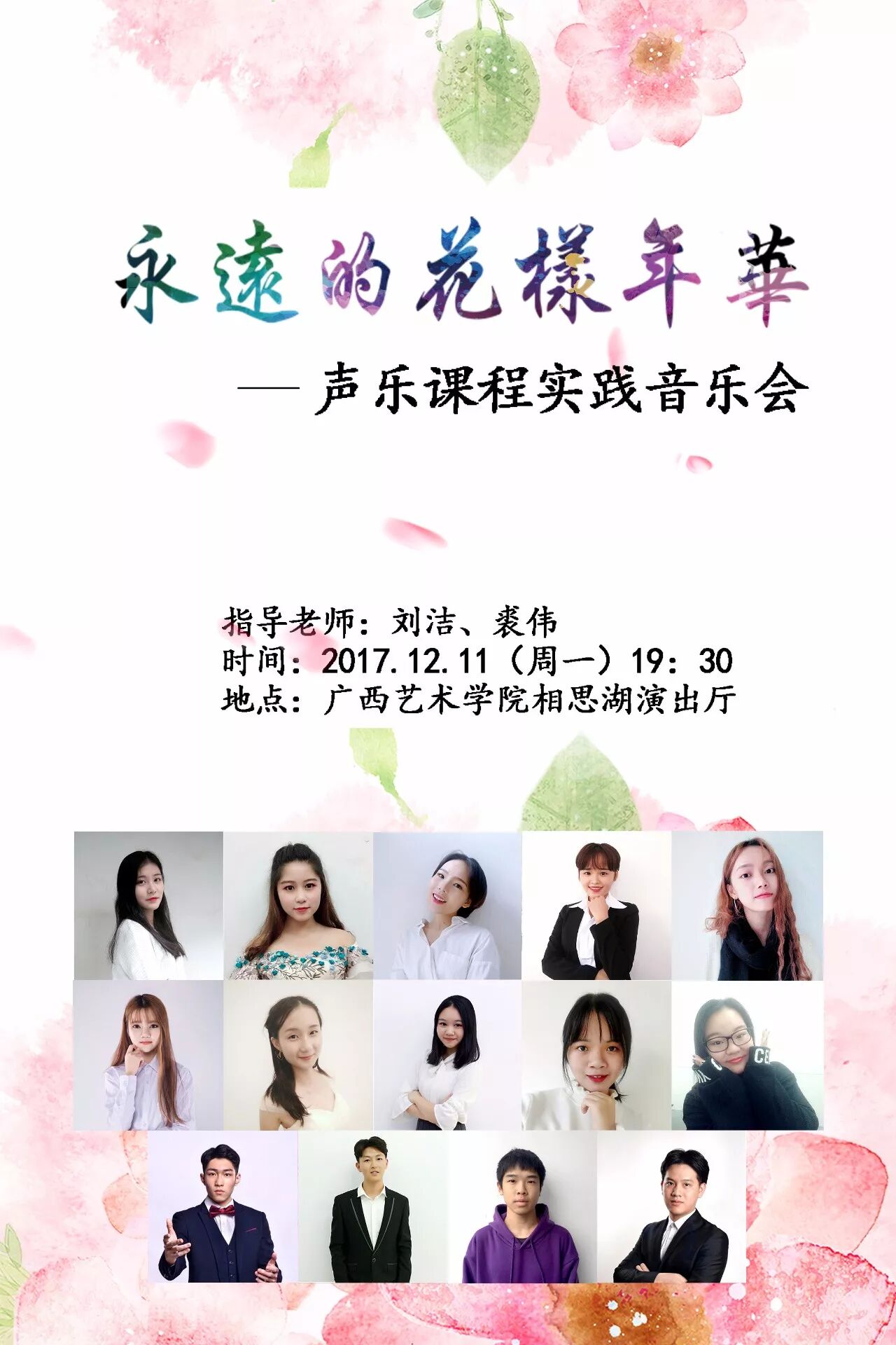 兹定于 2017 年 12 月 11 日(周一)晚 7:30 在广西艺术学院相思湖演出厅举办“永远的花样年华-声乐课程实践音乐会”,诚邀您莅临指导。