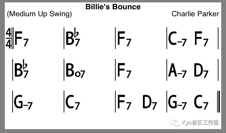 上节课我们讲了怎么开始爵士即兴练习,今天我们就拿《Billie's Bounce》来做个范本实践一下,爵士布鲁斯因为和传统布鲁斯的结构相同都是12小节的和弦进行,所以相对其他的爵士Standard在和弦进行这块要容易些。Billie's Bounce的曲式就是一段标准的12小节BLUES进行。不过由于是爵士布鲁斯,所以和弦替换是免不了的,这些替换都是来自于II-V进行。如果你是一个爵士入门的新手,那我建议先按原始的12小节布鲁斯来练习这首曲子:I级4小节;IV级2小节;I级2小节;V IV I V各1小节。如果标准12小节布鲁斯演奏的很顺畅了,那我们来看爵士版的布鲁斯: