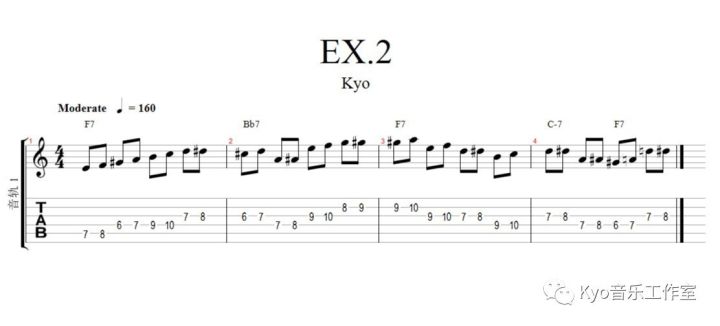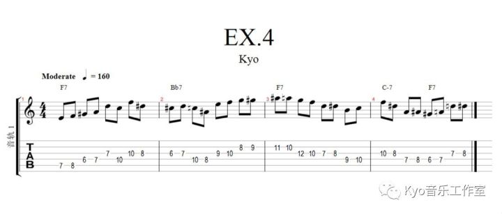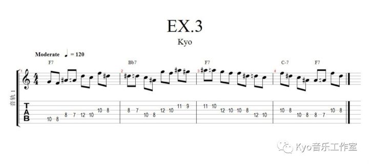 EX.3里我用的是上音阶音趋近,这个弹起来要比下半音趋近费些脑子了,它比下趋近要复杂,因为所有的趋近音都来自于各和弦对应的调式音阶。同样,这段练习也要练到行云流水的状态。