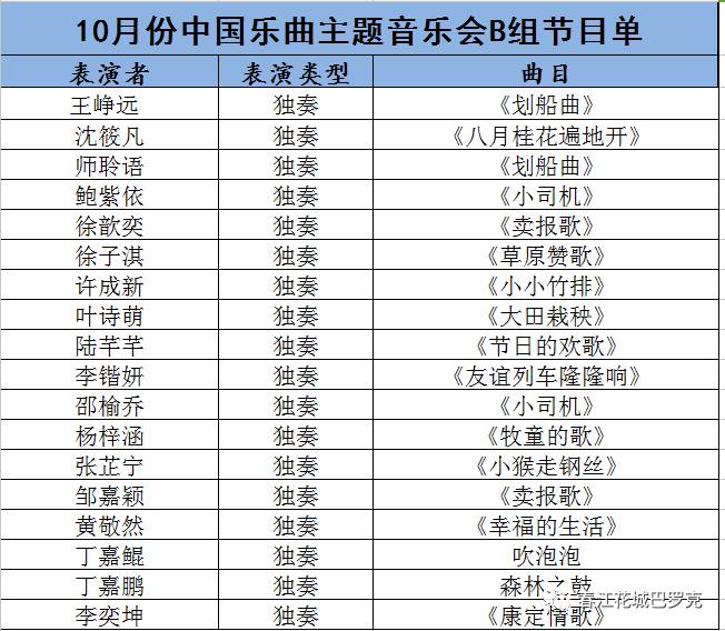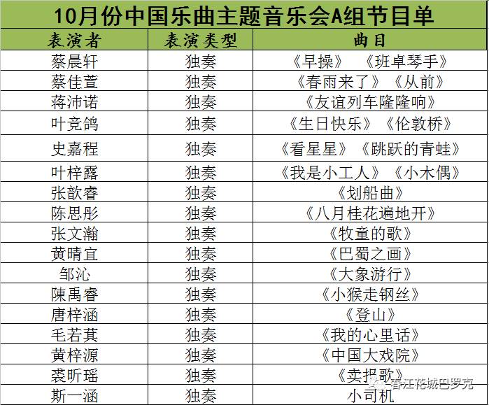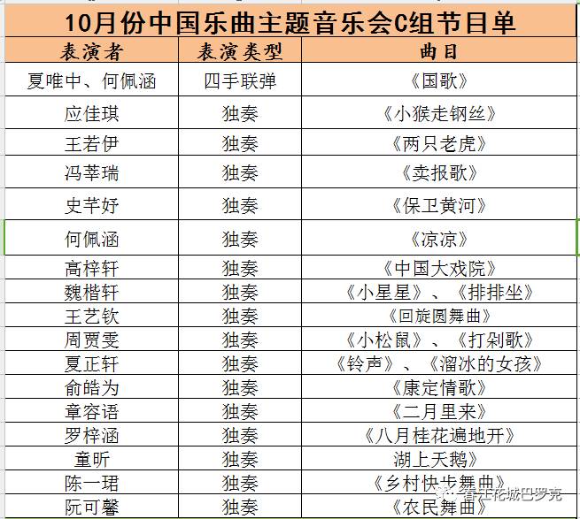 请各位老师、各位家长检查表演者的曲目,监督小朋友接下来一周对表演曲目进行背奏,如有疑问请及时联系。预祝10月份中国月区主题音乐会圆满成功!