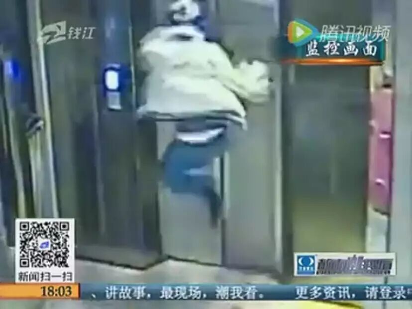 从监控画面中可以清晰的看到,当时小杨的情绪比较激动,周围人一直在阻拦,突然他就开始冲向电梯用脚踢了电梯门,后来又走了回去进了电梯,于是就直接掉到了停在一楼的电梯箱体上方。