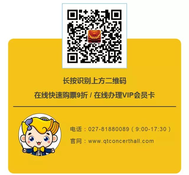 温馨提示:当日演出18点前可以微信购票,点击阅读原文轻松享在线9折优惠!18点以后只能在琴台票务中心(音乐厅)购买。