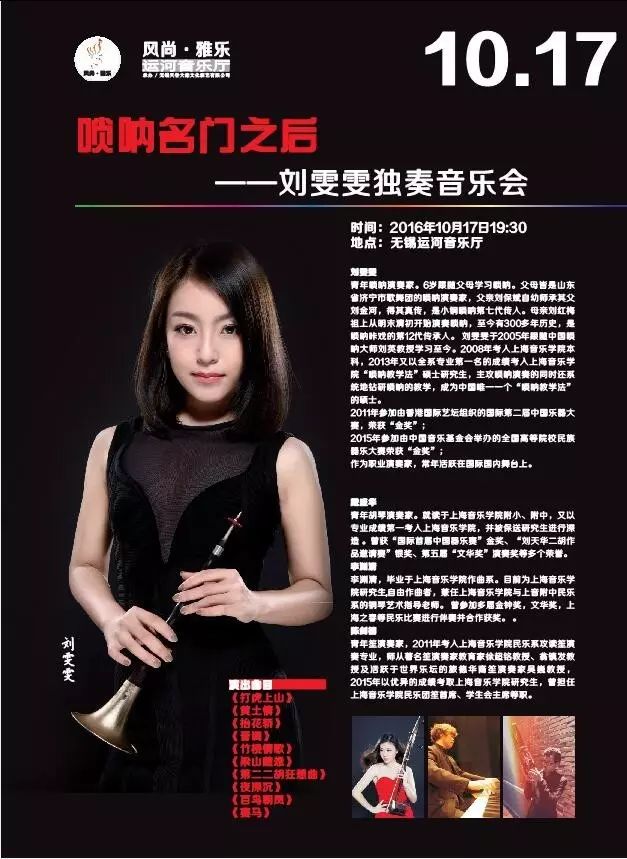 刘雯雯:青年唢呐演奏家。6岁跟随父母学习唢呐。父母皆是山东省济宁市歌舞团的唢呐演奏家,父亲刘保斌自幼师承其父刘金河,得其真传,是小铜唢呐第七代传人。母亲刘红梅祖上从明末清初开始演奏唢呐,至今有300多年历史,是唢呐咔戏的第12代传承人。刘雯雯于2005年跟随中国唢呐大师刘英教授学习至今。2008年考入上海音乐学院本科,2013年又以全系专业第一名的成绩考入上海音乐学院“唢呐教学法”硕士研究生,主攻唢呐演奏的同时还系统地钻研唢呐的教学,成为中国唯一一个“唢呐教学法”的硕士。