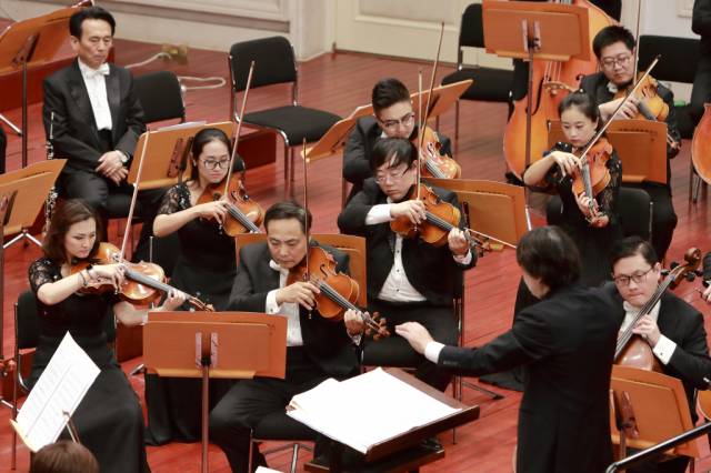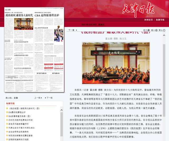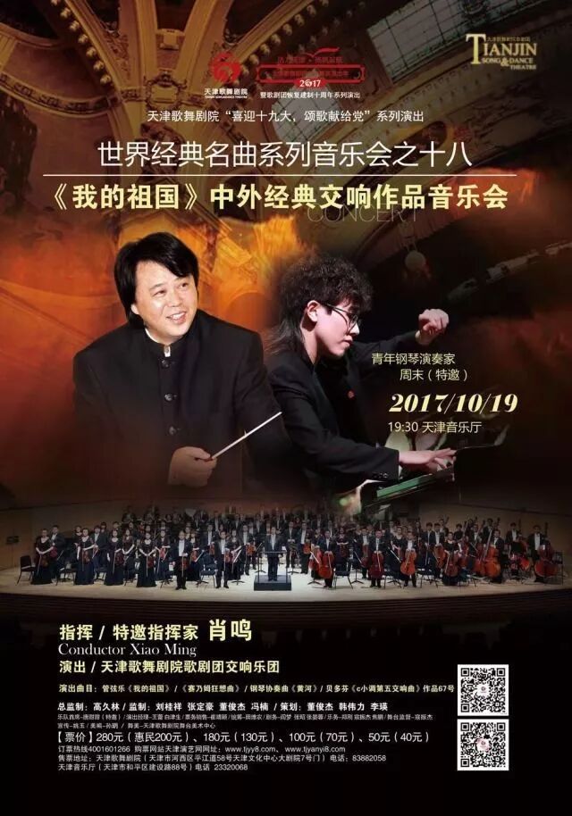 为庆祝党的十九大胜利召开,营造喜庆热烈的文化氛围,天津歌舞剧院推出了“喜迎十九大,颂歌献给党”系列演出活动。昨晚,特邀指挥家肖鸣、青年钢琴家周末与天歌歌剧团众多艺术家携手在天津音乐厅奉献了“我的祖国”中外经典交响作品音乐会。作为向党的十九大献礼的演出,本场音乐会全体参演人员满怀激情,用音乐的形式讴歌党、讴歌祖国、讴歌人民,为观众带来一道艺术盛宴。