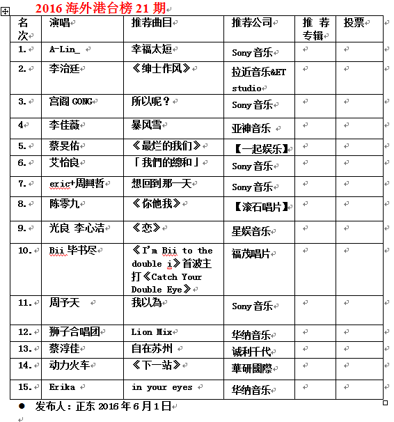 2016《新疆唱片风云榜》第21期上榜歌曲投票