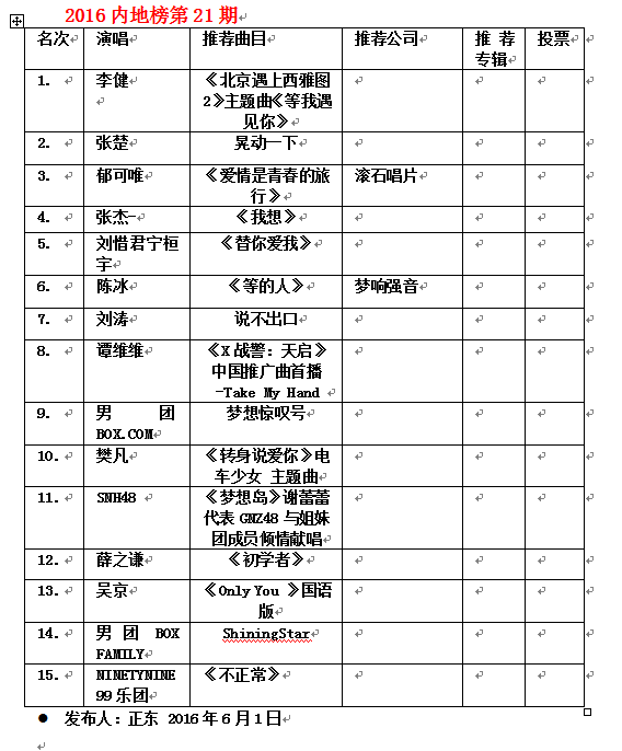 本期打榜时间:2016年6月1日 至 2016年6月8日 12:00 止