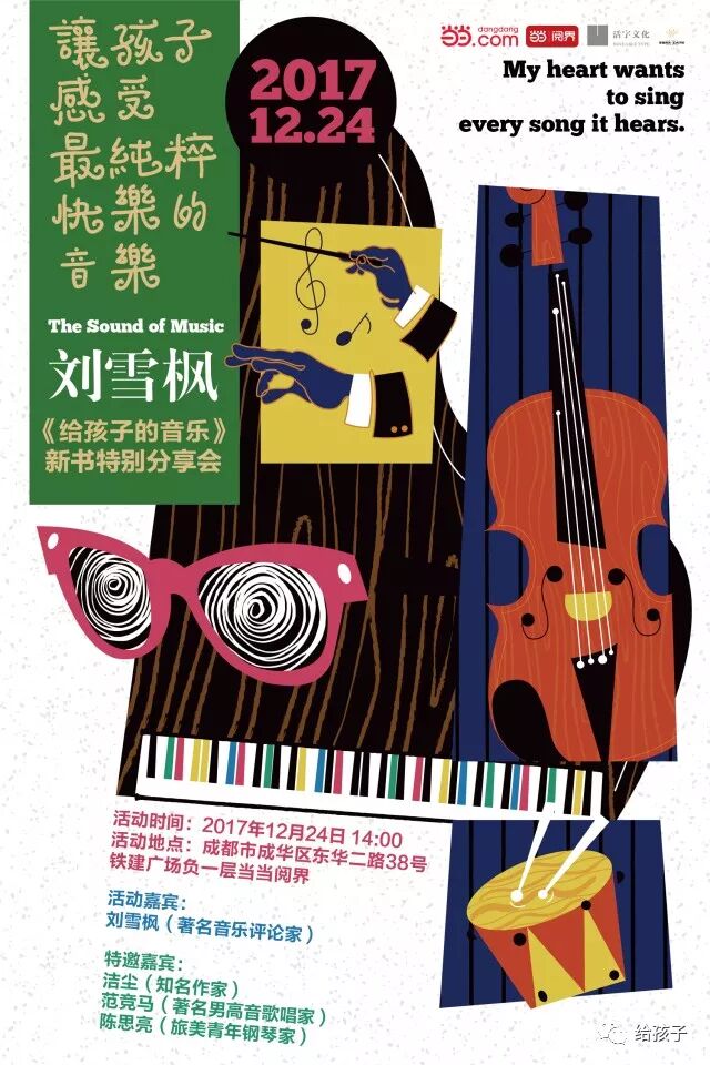24日下午14:00,「当当阅界成都铁建店」,刘雪枫《给孩子的音乐》特别分享会,让孩子感受最纯粹快乐的音乐。