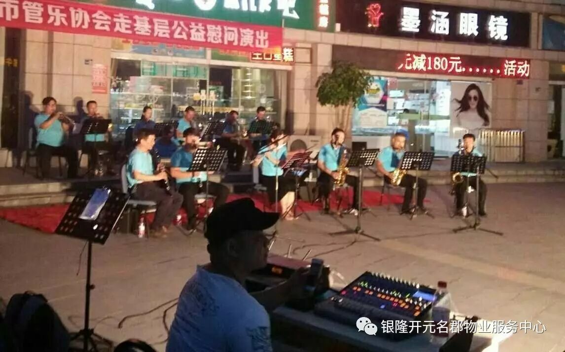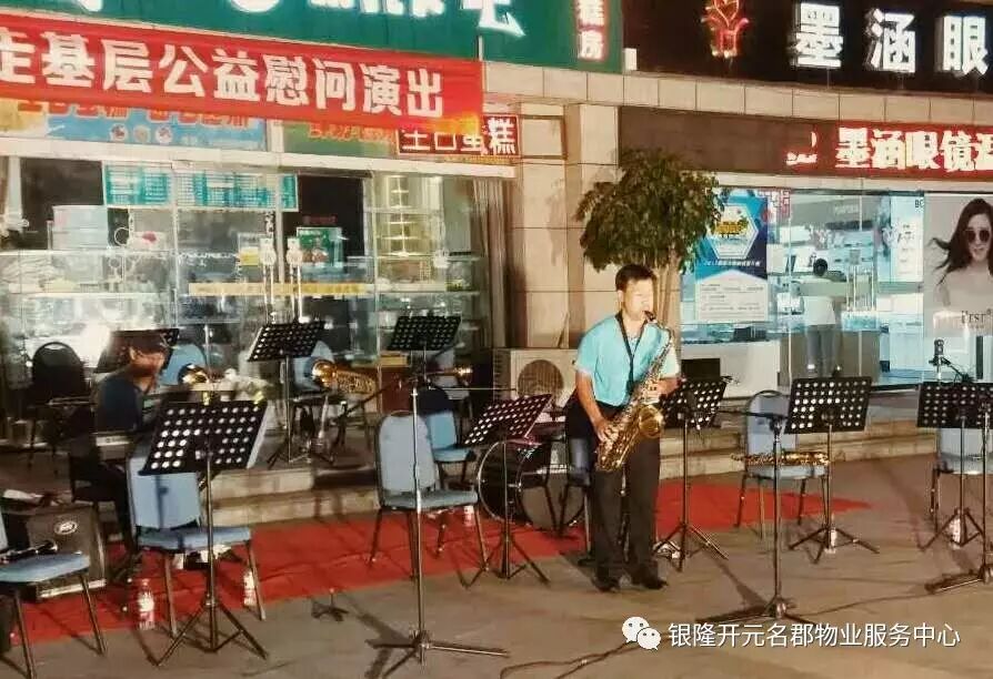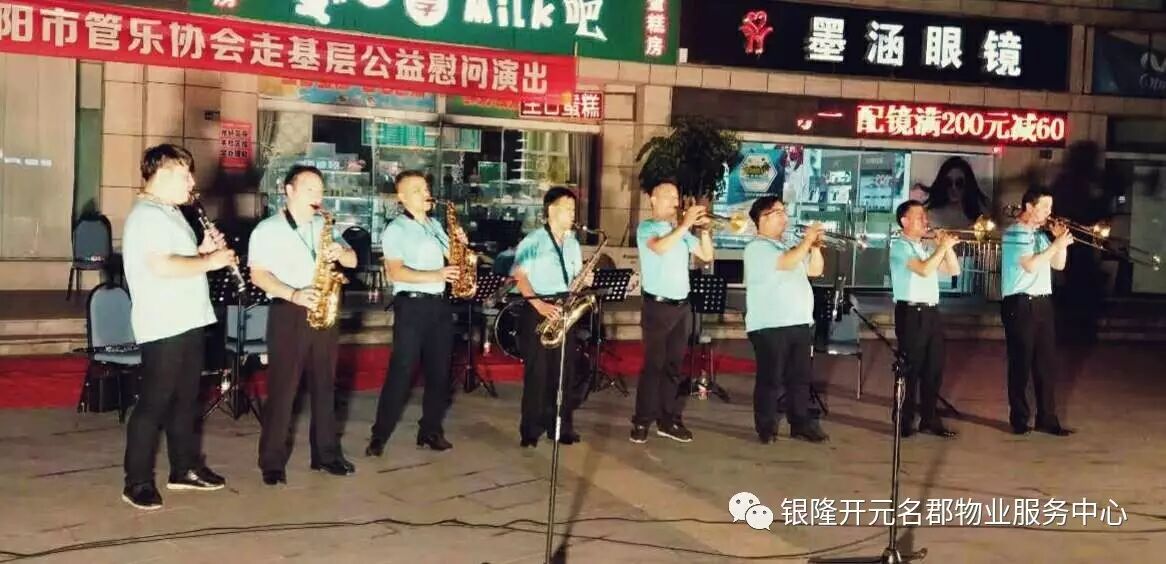 炎热的七月,人们都躲在清凉的空调房中避暑,但在开元名郡大门口的广场上,撩动心弦的悠扬乐声却把人们吸引过来。7月22日晚,开元名郡物业服务中心邀请洛阳管乐协会到小区为住户进行公益慰问演出,演奏者们将美丽悠扬的音乐带到住户身边,将西洋乐器与脍炙人口的的民族音乐相结合,使西洋乐器更加“接地气”,更加受到普通人的欢迎。演出现场布置