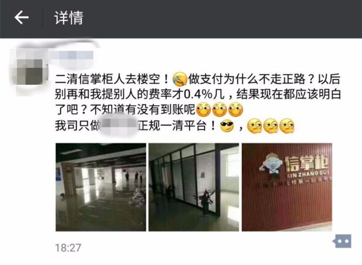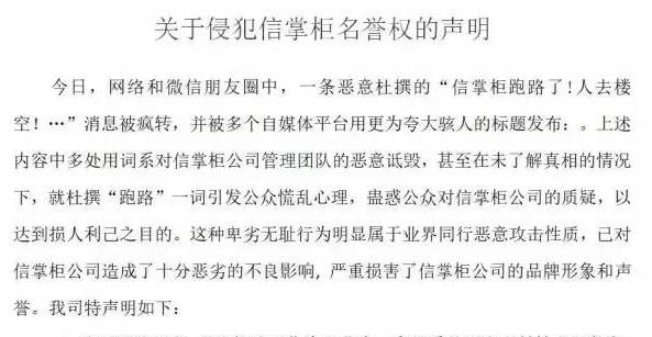 不久前,,公司人去楼空疑似跑路的消息。随即,“信掌柜”对外发布《关于侵犯信掌柜名誉权的声明》,声明表示跑路消息不实,是正常的办公场地搬迁,诸多媒体的发布信息属于恶意诋毁,希望立即停止侵权行为。