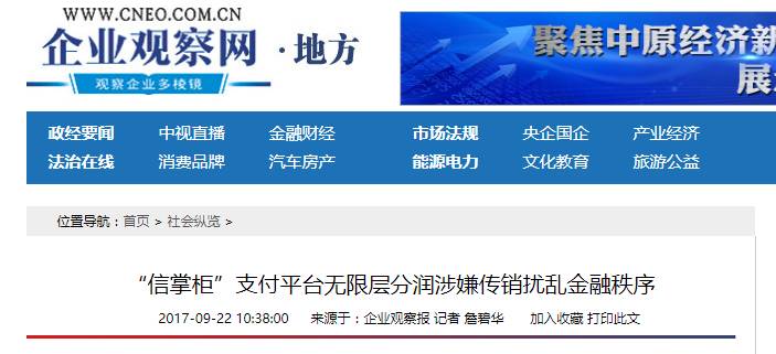 支付之家网(WWW.ZFZJ.CN) 据企业观察报记者詹碧华报道显示,“信掌柜”以拉人头发展下线层层获利,涉嫌无资质开展第三方支付业务,且持牌第三方支付机构“合利宝”、“恒信通”涉嫌向“信掌柜”提供支付通道。