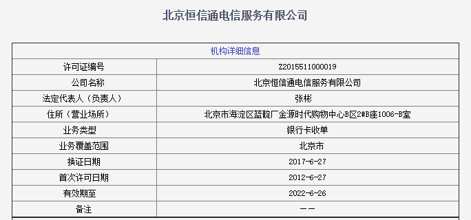 据了解,“恒信通”系北京恒信通电信服务有限公司,主要服务于公共事业缴费。北京恒信通的支付许可证中载明的业务类型为银行卡收单,业务覆盖范围为北京市。