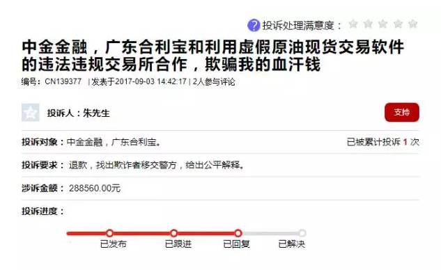 据媒体去年报道,广州合利宝支付科技有限公司因违反非金融机构支付服务管理规定、银行卡收单业务管理规定,被中国人民银行广州分行做出罚款75000元的行政处罚决定。近日,聚投诉网站显示,广东合利宝、中金金融疑似为“微盘”类微交易平台非法交易场所提供支付结算服务,用户朱先生投诉两家支付公司退款并找出欺诈者移交警方并给出公平解释。