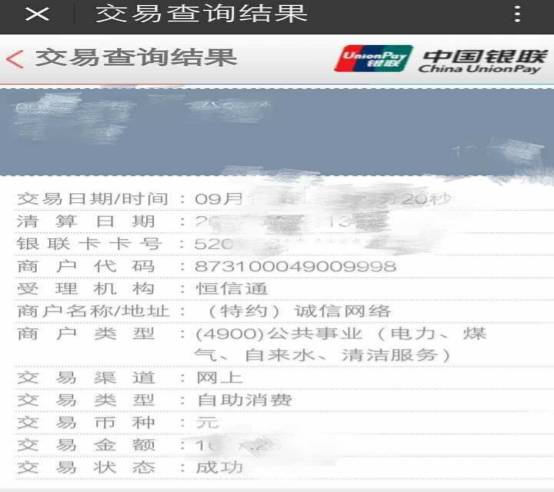 另外,北京恒信通也被爆涉嫌违规向“信掌柜”提供公用事业支付通道套现。记者测试的交易信息通过中国银联查询交易结果显示,受理机构为“恒信通”,商户代码为873100049009998,商户类型为(4009)公用事业(电力、煤气、自来水、清洁服务)。