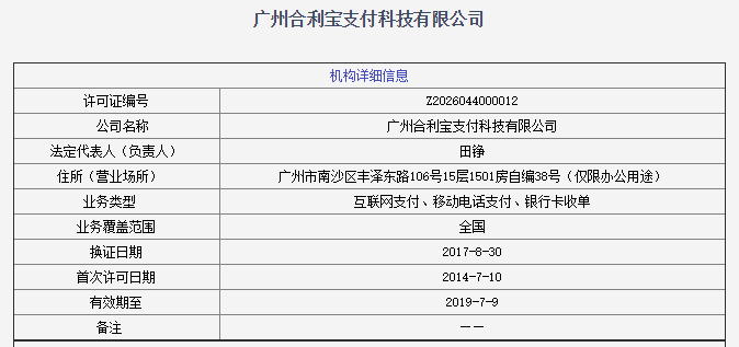 公开资料显示,合利宝支付持有中国人民银行于2014年7月10日核发的《支付业务许可证》,业务类型包括银行卡收单、互联网支付及移动电话支付,业务覆盖范围为全国。