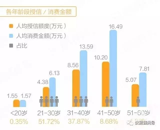 其中,21-30 岁之间的用户群是信用卡主要发卡对象,人均授信额度和人均消费额最高的年龄段均分布在 41-50 岁之间。