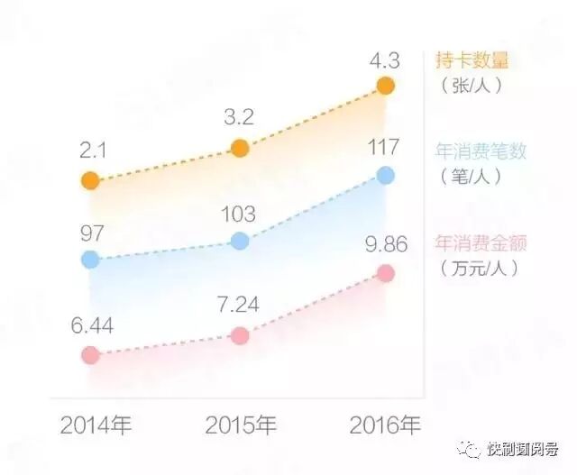 某专业信用卡平台发布的《2016 信用卡活跃用户消费报告》指出,截至 2016 年底,活跃信用卡用户的人均持卡量已增至 4.3 张,较 2015 年增长 34.38%。与此同时,活跃信用卡用户的人均年消费金额也从 2015 年的 7.24 万元增加至 9.86 万元。