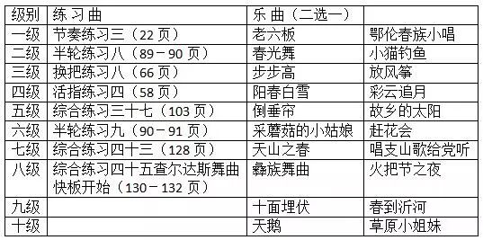 本考级定为十个级别,2017年各级别考试曲目按以下表格内的规定为准。要求如下: