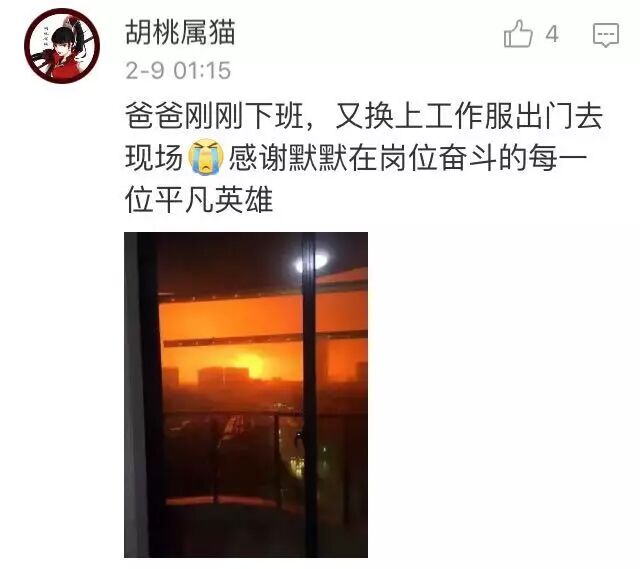 网友@CALLMeYEYE_ :晚上十点四十刚进家门,突然房子震了几秒,天一下亮了。还以为小区内是不是有人家天然气爆炸。然后朋友圈立马很多人刷,问刚刚怎么回事,一分钟后就开始有图片出来了。爆炸地点离我家2.6公里。幸好无人员死亡。先在想想挺后怕的。