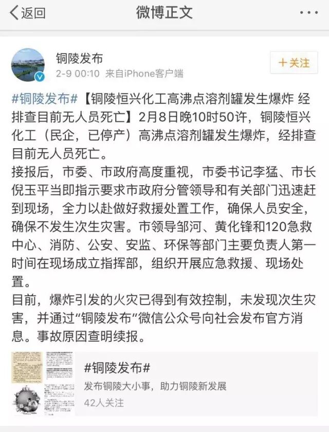 安徽省铜陵市人民政府官方微博9日零时通报称,8日22时50分许,铜陵恒兴化工(民企,已停产)高沸点溶剂罐发生爆炸,经排查,目前无人员死亡。