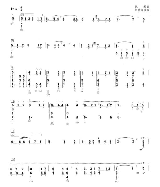 此曲是美国作曲家凯利于1973年创作的,原名为“Home on the Range”。该曲在美国西部的牧区极为流行,常为人们在放牧或于篝火旁休息时哼唱,被誉为堪萨斯州的州歌,还曾作为电影《战斗的海岸卫士》的插曲。改变后的琵琶乐曲,流畅而优美的牧谣旋律使音乐更富有抒情性和歌唱性。演奏时应注意“挑轮”及“名指摇”等技法的纯熟应用,要奏的流畅而舒展。