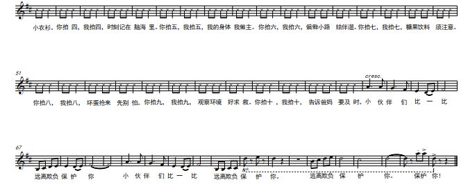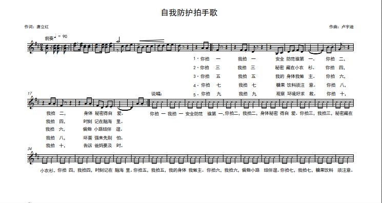 《自我防范拍手歌》是2017年由中央音乐学院电子音乐作曲研究生进修生卢宇迪先生作曲、编曲,。 据说,、,准备今后在幼儿园、中小学校推广、传唱,预测《自我防范拍手歌》歌曲对宣传、保护未成人具有一定的社会价值。