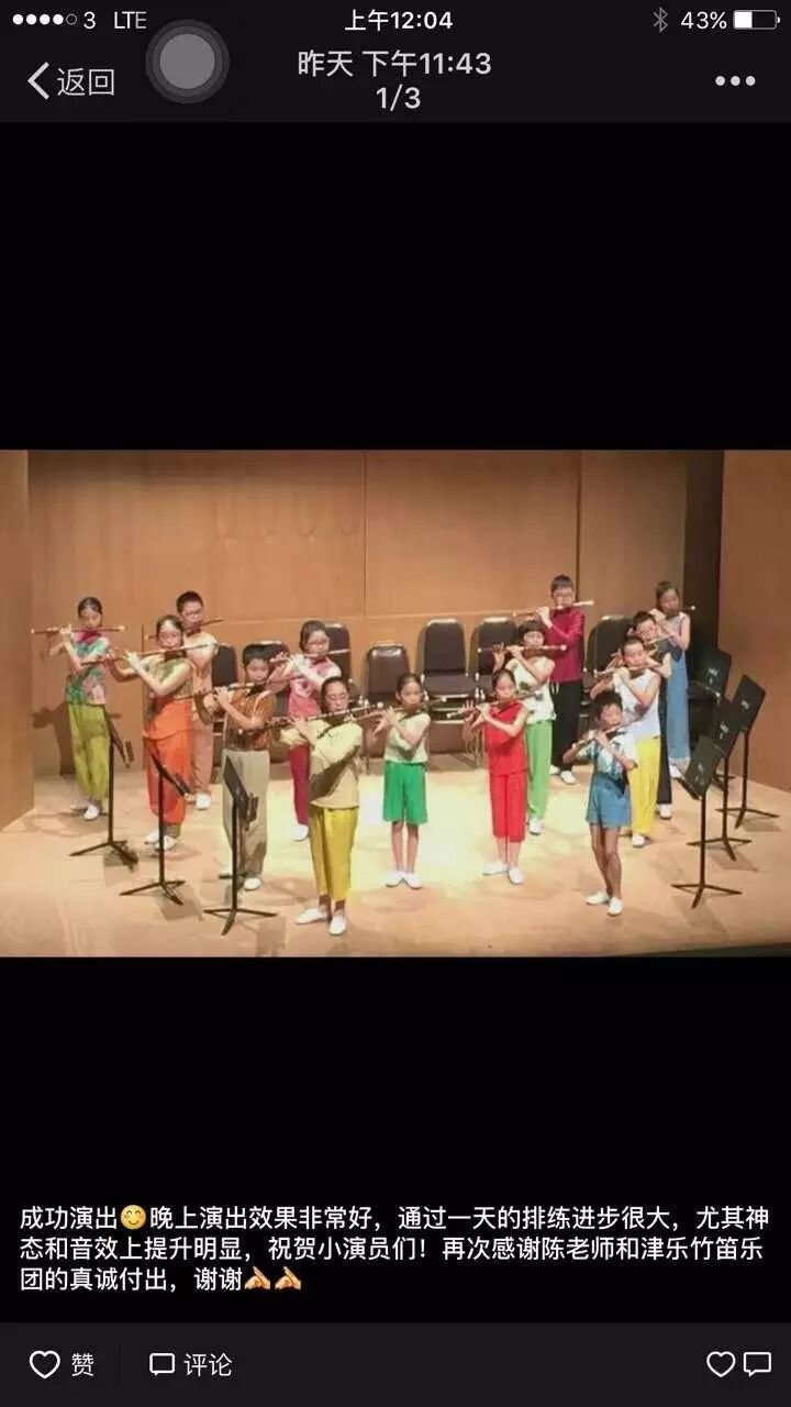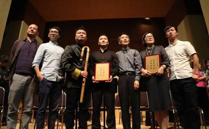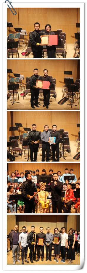 我想晚上的演出就不必介绍了,这已经不那么重要,重要的是音乐会结束,双方互赠礼品和合影留念。津乐赠送采一教育集团“严育为采,习传碧荷”牌匾,赠送清韵“清风翠竹,韵律妙传”牌匾。清韵赠送津乐一只绝无仅有倍G调低音竹笛,而且此笛的笛胚还是由赵松庭先生生前留下来的,弥足珍贵。我后来问及钟老师为何送这么珍贵的礼物,他说津乐缺少一只倍G,这只笛子只有在他那里才能真正体现它的价值。这真是三件礼品都有一个共同“传”字,是传承,是教育。