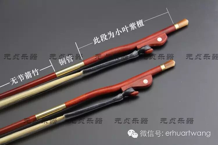材质:弓要选用天然的竹子作为材料,或者是名贵材料。但不管什么材料,材质的品质就是至关重要的。优质的材质,当你轻轻地拿起来,马上就能感受到它的弹性、韧性,以及一种“沉甸甸”的手感。一般地说,弓杆的优劣,要看材质是否粗细均匀,弓杆是否圆润。材质相同,及直径和长短相同的的弓,应以个人习惯来定。弓子的轻重长短,都要根据自己的习惯来选择。专业人士一般对弹性要求较高,无论是什么弓子,粗细、弹性要适中。材料主要是竹子为主,2008年元贞乐器结合小提琴弓的特点,开发了接把二胡弓子(手柄位置接黑檀或者紫檀,以铜管连接),现在已经有许多厂家仿制这种琴弓。