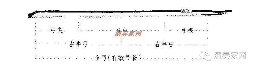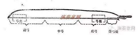 一般地讲,左半弓轻快而有弹性,拉推很舒适,右半弓扎实而丰满。弓根在右半弓内,有力度,但因带有自身重量和手臂压力,最不灵活。弓尖离手臂远,压力弱自重小,虽灵活但少力度。弓中占用左半弓和右半弓,其特点两者兼而有之,较为灵活较有力度。