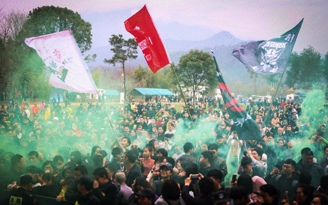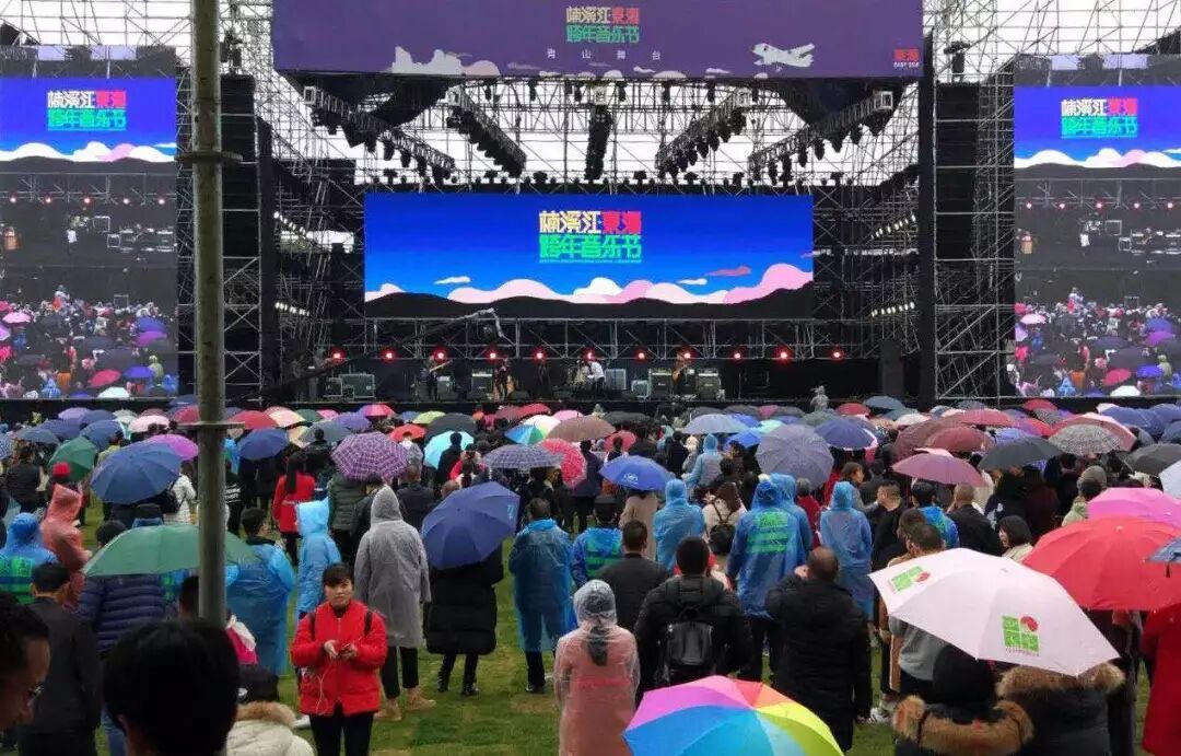 刚过14:00点,天公不作美,下起了小雨,但即使这样,仍然挡不住音乐节的魅力,数千名游客陆续到达楠溪江滩林音乐公园——楠溪江·东海跨年音乐节演出场地,把青山舞台围了个水泄不通。温州本土的柯毡乐队、浙江音乐学院的Booster、温州著名金属摇滚乐队的时刹陆续上台演绎,台上是炫酷的音乐,台下是热情的欢呼,一阵高过一阵的高潮中,激昂的音乐循环飘荡在空气中,青春的热烈在空气中弥散,人们的热情开始逐渐高涨。