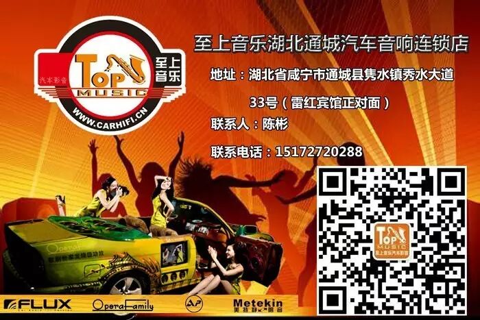 至上音乐湖北通城汽车音响连锁店:有专业音响试音系统及改装车间,经营品牌有:德国FLUX佛伦诗、OperaFamily歌剧世家、 SINE WAVE正弦波、迈博特、美特静隔音(SGS欧盟ROSH认证)。负责人陈彬先生从事汽车音响行业多年,汽车音响安装、调试、销售及宣传推广为一身的行业内不可多得的全能型人材,得到了行业内的共同认可,并在汽车音响比赛中获得佳绩无数。