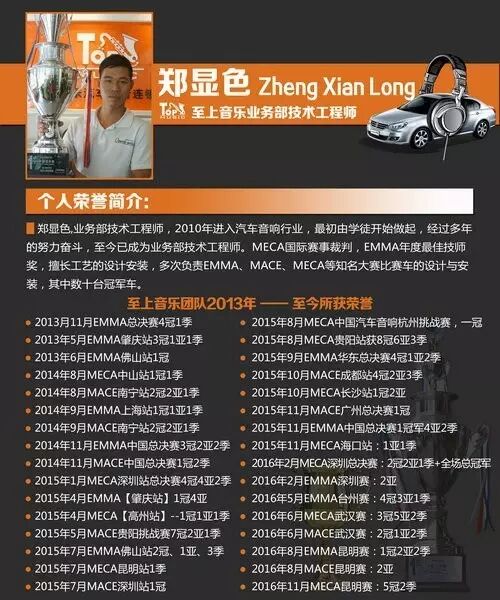 人物三 郑显色业务部技术工程师,2010年进入汽车音响行业,最初由学徒开始做起,经过多年的努力奋斗,至今已成为业务部技术工程师。MECA国际赛事裁判,EMMA年度最佳技师奖,擅长工艺的设计安装,多次负责EMMA、MACE、MECA等知名大赛比赛车的设计与安装,其中数十台冠军车。
