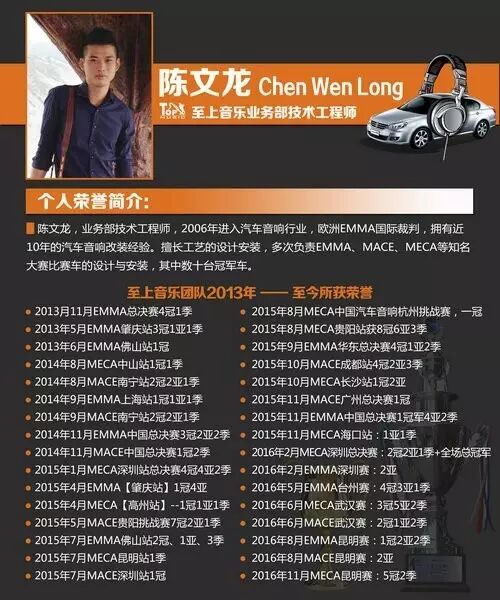 人物一 陈文龙:业务部技术工程师,2006年进入汽车音响行业,欧洲EMMA国际裁判,拥有近10年的汽车音响改装经验。擅长工艺的设计安装,多次负责EMMA、MACE、MECA等知名大赛比赛车的设计与安装,其中数十台冠军车。