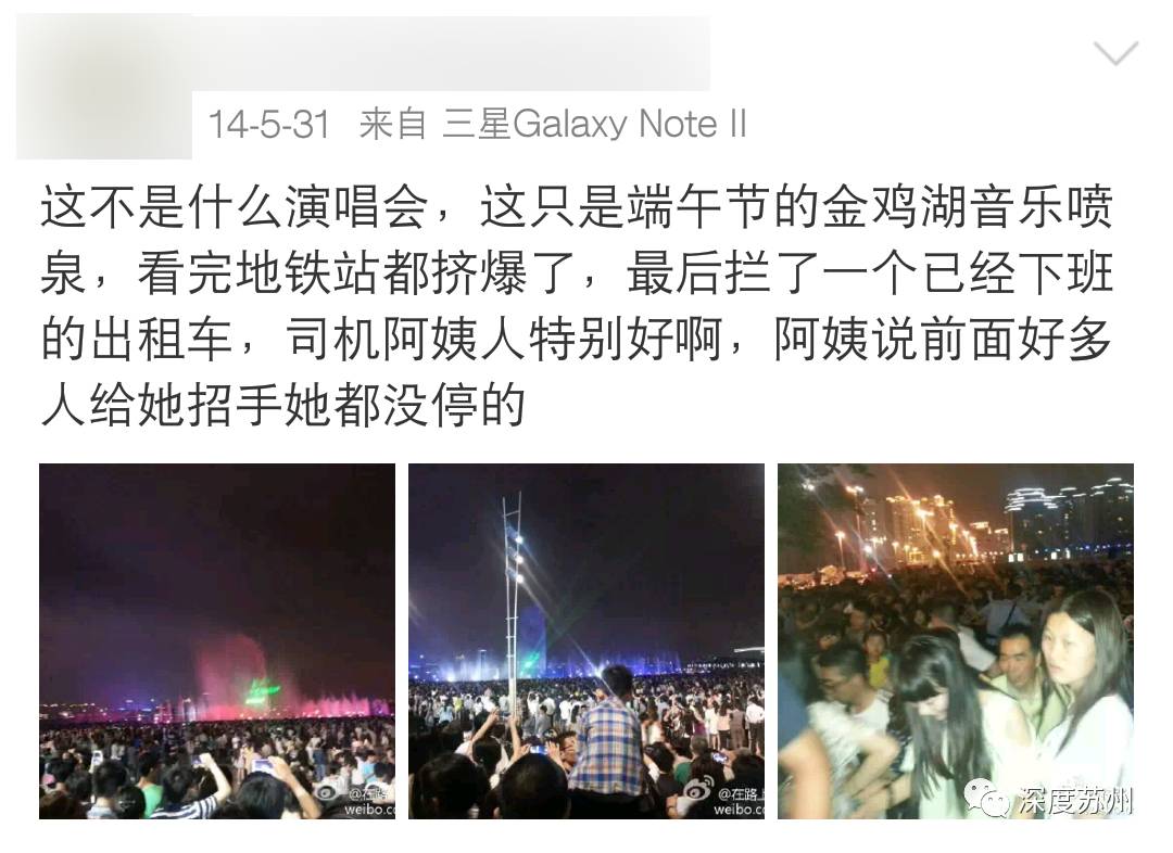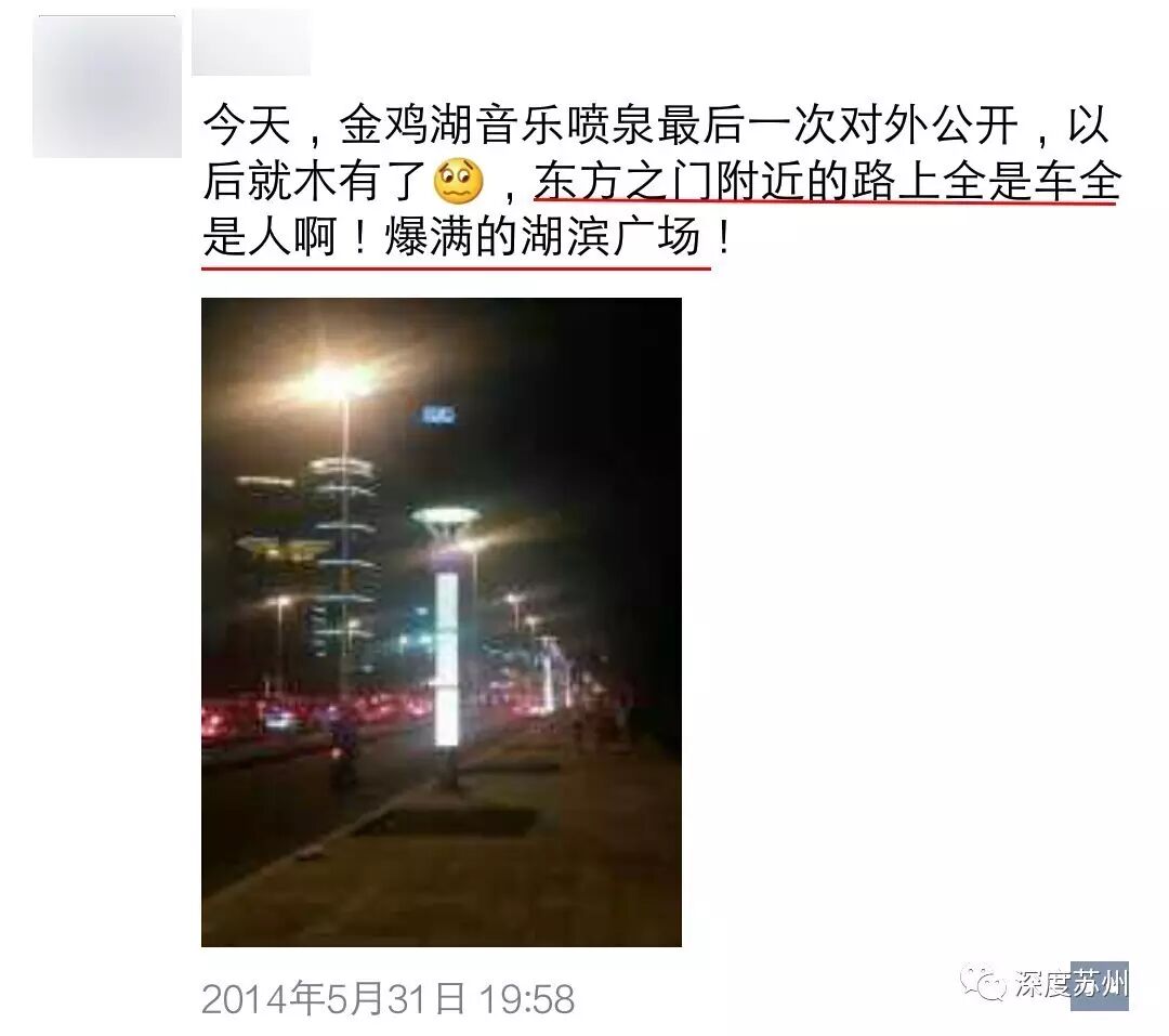 从2014年6月1日起,金鸡湖音乐喷泉因为道路改建工程停止开放。每每想起她,苏州人心里都有一个小疙瘩。三年前最后的谢幕演出数十万苏州人为其作别,引发全城大堵车,当时深度君也去看了,挤到信号都没了。