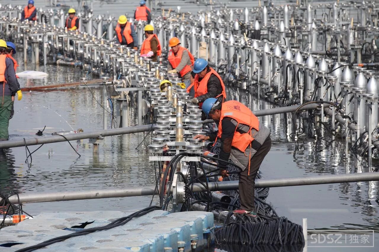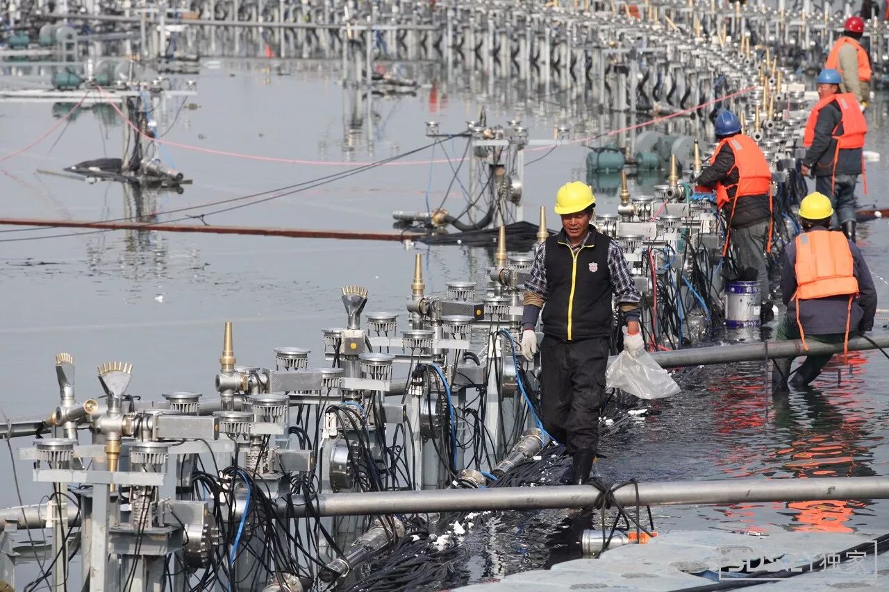 所有电缆都包得严严实实,正铺在湖面浮板上。可以看到每一个喷嘴附近都有大量电缆围绕。